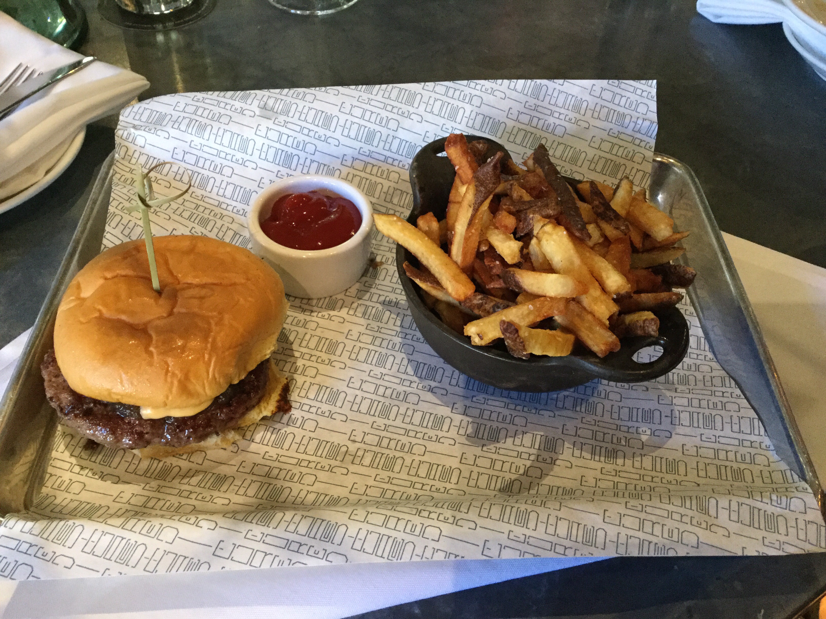 The Single Blue Ribbon Burger and fries- Bacon and beef blend burger, onion jam, and American cheese.